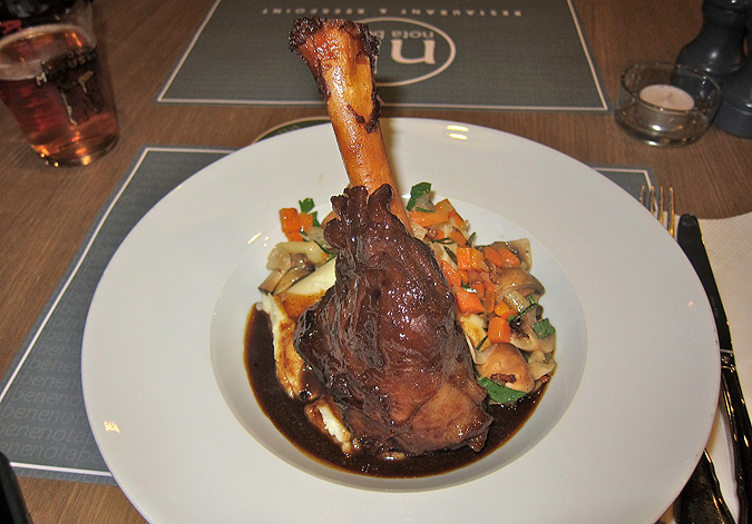 When the menu arrived, I quickly knew what I wanted. I ordered the lamb shank on red wine with mushrooms, vegetables, and mashed potatoes (345 CZK).