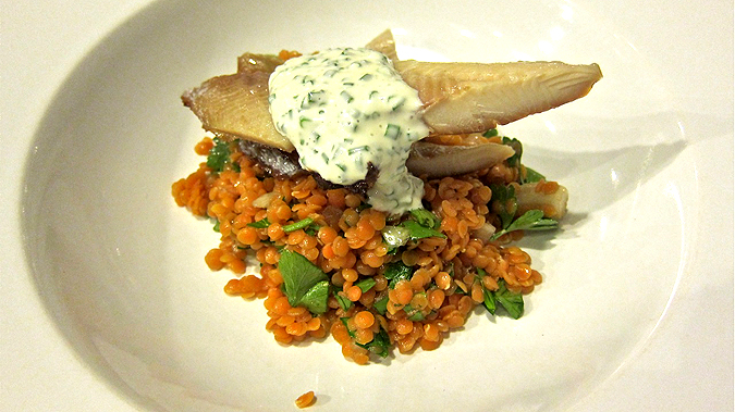 The dense, cold fish was certainly smoky, but also a little dry. It was topped with tartar sauce made with chives. What really stood out was the cool, red lentils simply mixed with parsley and onions. That was delicious.
