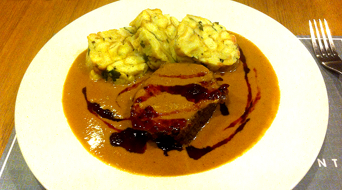 For my meal, I saw one of my favorite Czech classics on the menu, the svíčková na smetaně, which basically translates as beef tenderloin on cream sauce (185 CZK). This was one of the better ones I’ve had.