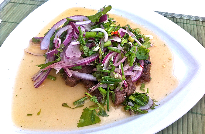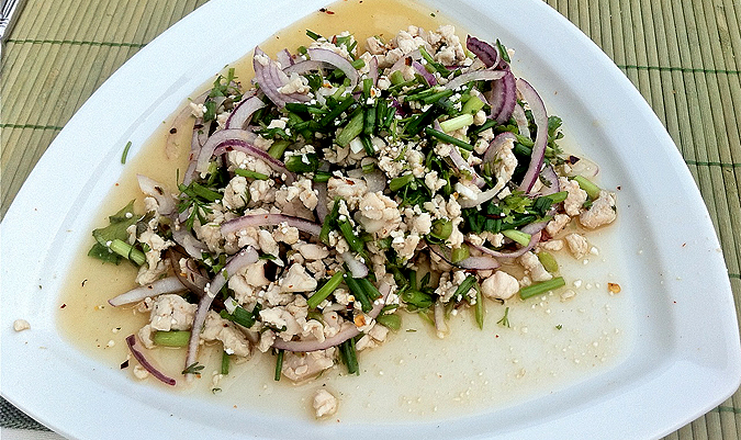 Inspired by my choice, G-Man ordered the Lab Kai (165 CZK). This is billed as a salad with fresh coriander, mint, onion, lime, and chicken.