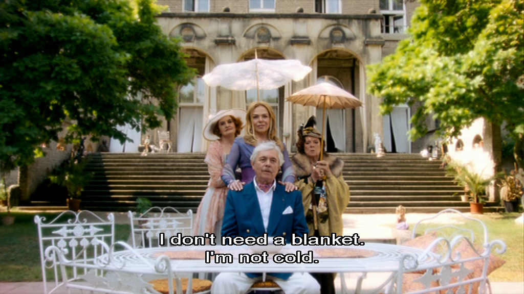 The story, in short, involves ex-chancellor Vilém Rieger (played by Josef Abrhám), who has recently left office. He lives with his ‘long-time companion’ Irena (Dagmar Veškrnová-Havlová, the director’s widow) and other family members at a gorgeous country estate, and the state – represented by Vlastík Klein (Jaroslav Dušek), a thinly-veiled parody of current president Václav Klaus – is threatening to kick them out of it.