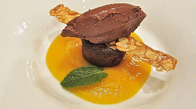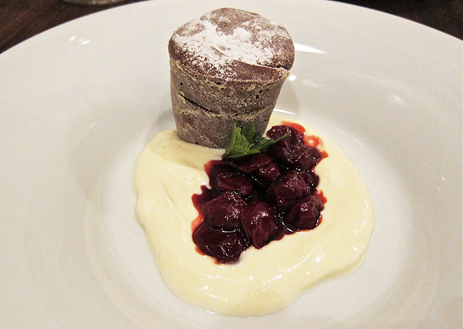 It came with sour cherry “ragout” which was a terrific contrast with the warm chocolate. Crème fraîche was also on the plate to add a cool balance.