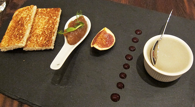 It came with ginger chutney, fruit coulis, a slice of fresh fig, and two small pieces of toast.