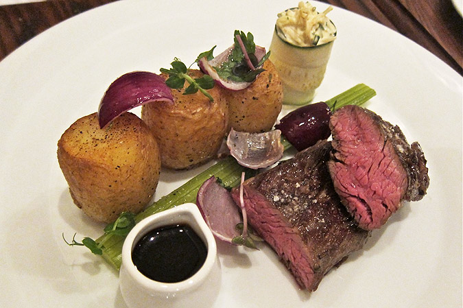 However, it came with a delicious red wine “gravy,” something of a demi-glace, that added a savory richness. Adam particularly enjoyed the lightly-cooked red onions. The potatoes were competently cooked, but also fairly flavorless. The little celery-zucchini “salad” on the side had too much mayo.