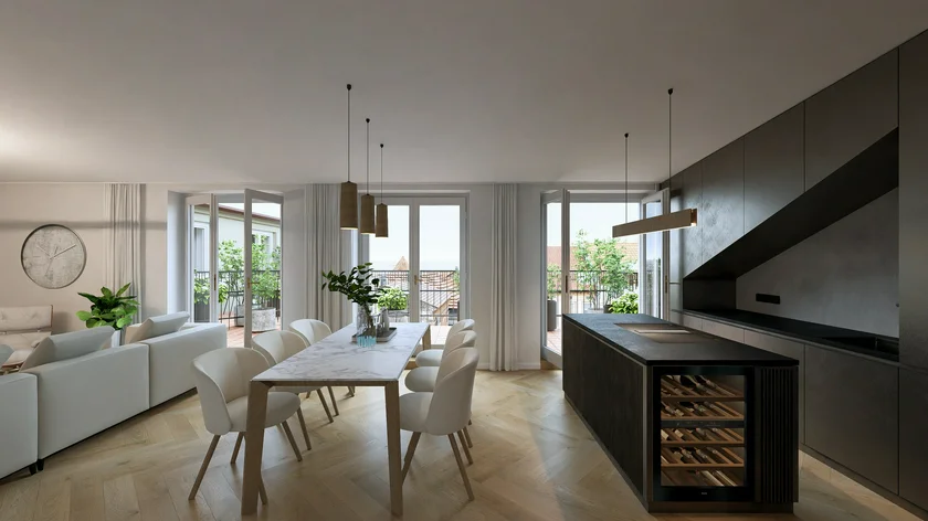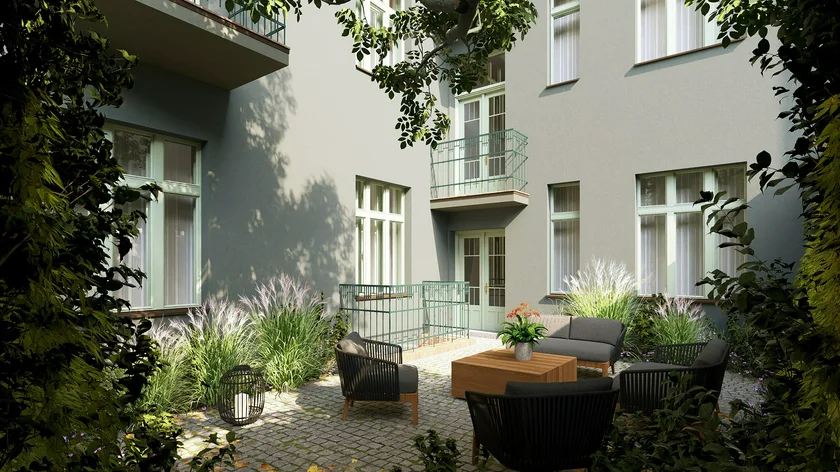 The building includes ample cellar storage, a private courtyard, a sauna, and a fitness area, all designed for quiet living in a busy part of Prague. There are also three ground-floor showroom commercial units, offering opportunities for residents to connect even closer with services in their community.