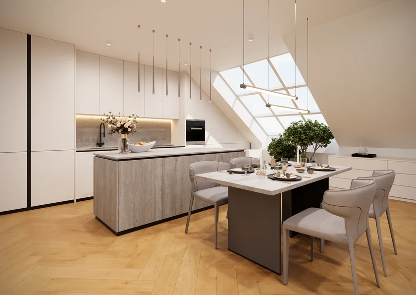 The building’s sleek contemporary flats range from cozy one-bedrooms to spacious layouts suitable for young professionals, growing families, and more. The rooftop apartments have been designed with privacy and comfort in mind, with layouts emphasizing natural light and flexible use of space. New units in a discreet rooftop extension are furnished with underfloor heating, air conditioning, fireplace prep, and sunlit terraces with sweeping city views.