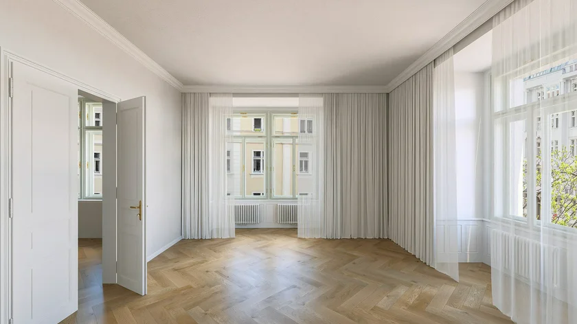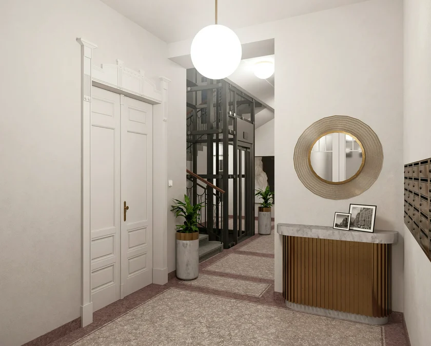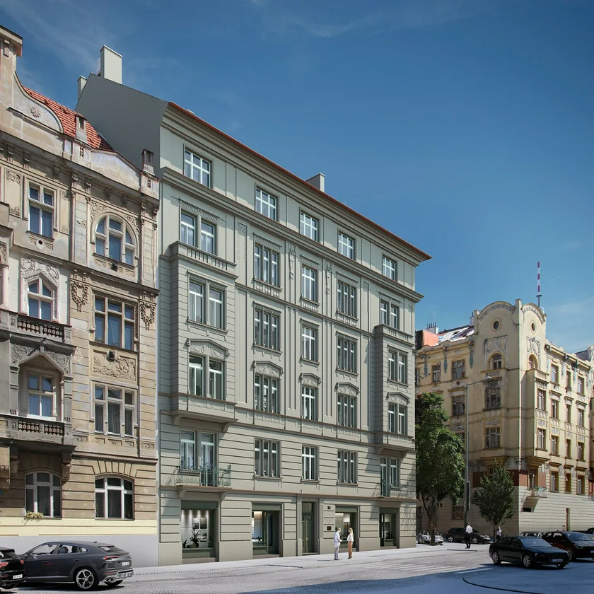 On the corner of leafy Polská Street just steps from Riegrovy Sady and Náměstí Jiřího z Poděbrad, you’ll find a classic Art Nouveau building, meticulously renovated to balance historic charm with 21st-century city living.