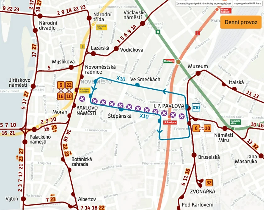 Replacement bus service X10 will run between I.P. Pavlova and Karlovo náměstí in the day and X91 will run at night. Tram 32 will be introduced between Zvonařka and Zahradní Město. Two temporary tram stops will be established near I.P. Pavlova on Jugoslávská Street and Bělehradská Street. A complete list of all the changes can be found on the Prague Public Transit Company website and up-to-date information will also be in the Lítačka app.