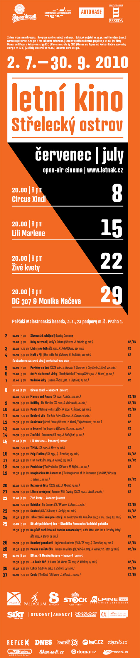 The area is opening at 7 pm, concerts starts at 8 pm and movies at 9:30 pm. See more information on www.letnak.cz . Just come, relax and enjoy interesting movies right in the heart of Prague!
