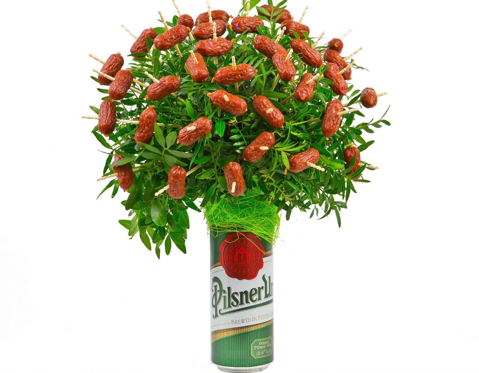 Look no further: Prague-based flower shop Květiny dnes offers a unique range of gifts for men. That includes some rather unique bouquets filled with, yes, beer and sausage.