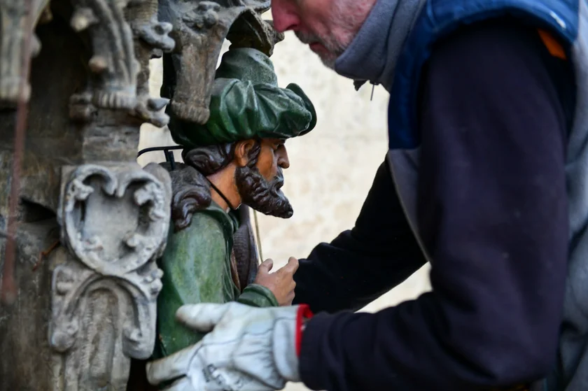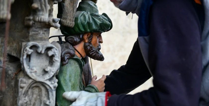 These wooden statues were removed Wednesday afternoon for a regular application of transparent varnish. The old protective coating has degraded due to weather conditions.
