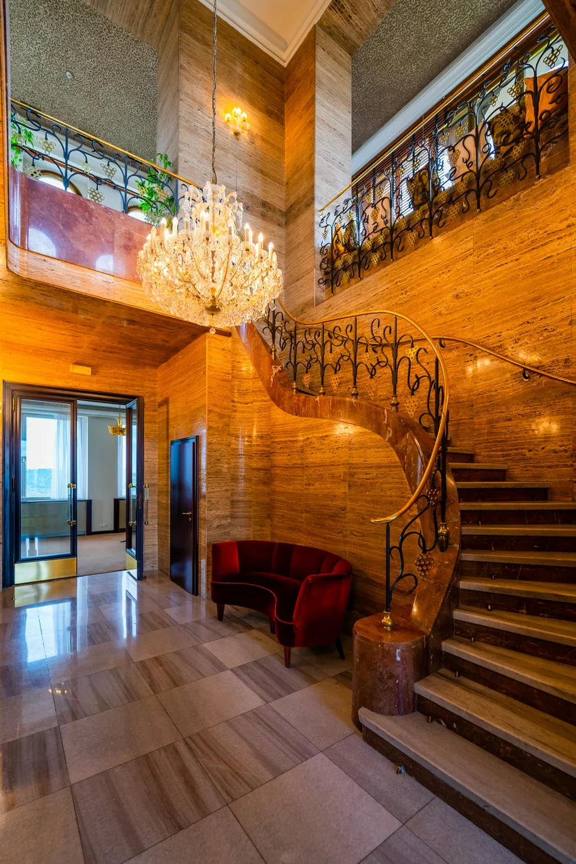 The highlight of the bar is a mosaic by Czech painter Max Švabinský, whose other credits include designs for Czechoslovak paper money and a stained-glass window in St. Vitus’s Cathedral. Many other artists and craftspeople contributed details including a massive chandelier. Metal outlines of bunches of grapes are a running motif on the stair railings, hinting at the wine available at the bar.