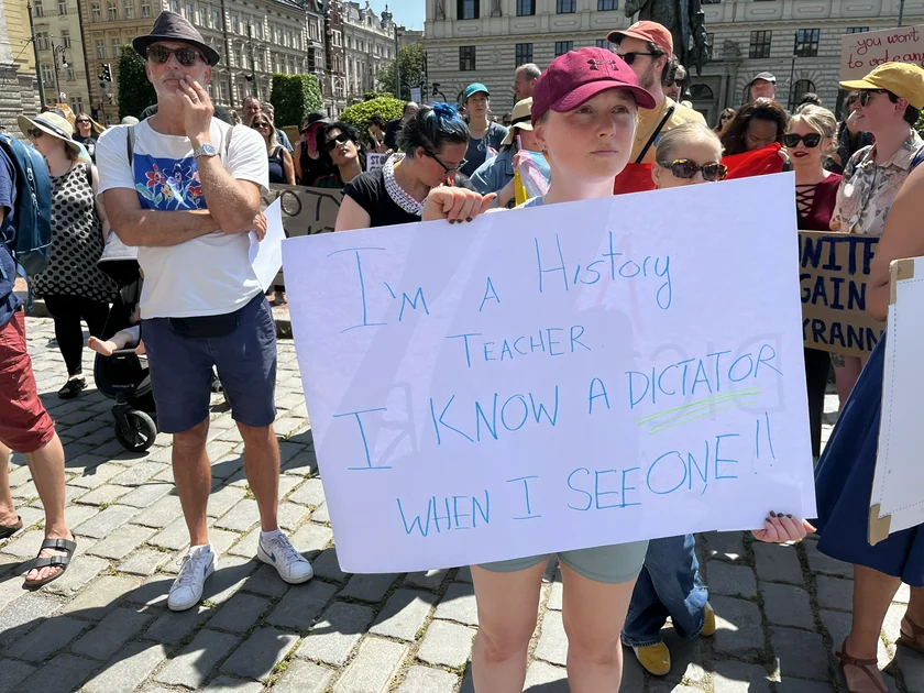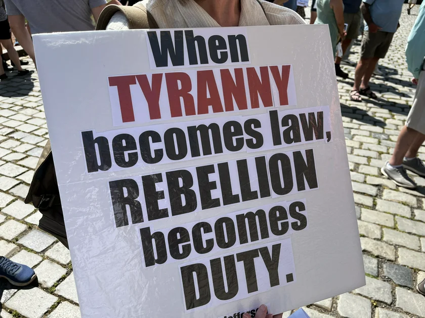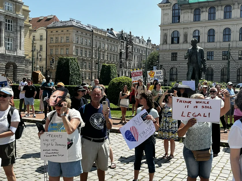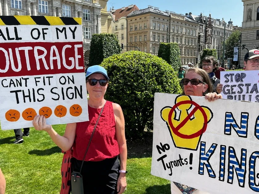 The Prague event, titled the No Tyrants protest, was organized by Democrats Abroad Czech Republic and the International Unitarian Church of Prague. Participants waved American flags and held signs with slogans such as “No kings, no tyrants” and “Apathy is not an option.”