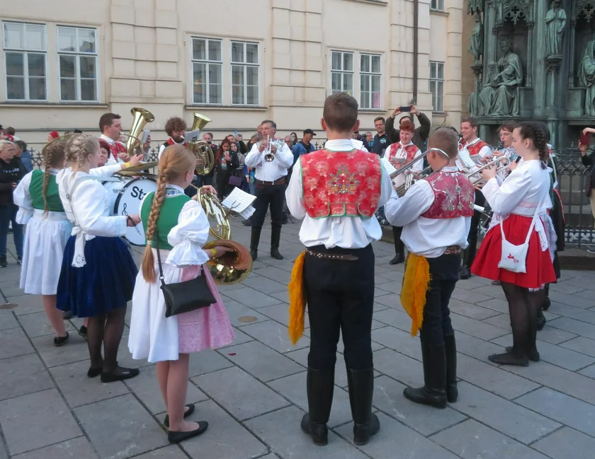 After a mass at St. Vitus’ Cathedral in Prague Castle, a procession carrying artifacts related to St. Jan, including a statue and other wooden sculptures, went through Malá Strana and stopped on Charles Bridge for prayers and benedictions in front of the statue of St. Jan and at a marker that shows the spot where his body was thrown from the bridge in 1393 after he died from torture. Both of these spots are popular attractions for tourists, who often form lines to touch them.