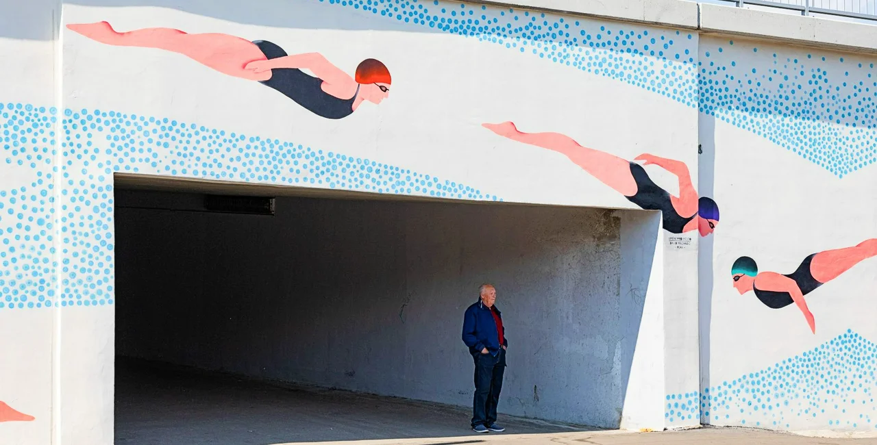 David Mazanec has transformed a gray dull tram turnaround at Nádraží Hostivař into a colorful swimming pool, in which swimmers circle around in an endless day and night loop, just like the trams whose "life" inspired the artist.