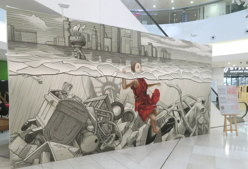 In Prague's Modřany district, you can find an optical illusion-style mural on the side of a commercial building that sells plastic windows. The image shows a woman in an abandoned building, with a devastated landscape outside. On Instagram, he said it was about climate change.
