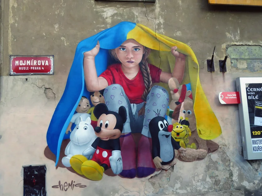 Unveiled a year ago on Mojmírova Street in Prague 4, the artist said of this mural, depicting a girl under a Ukrainian flag surrounded by toys. "Ukraine is now fighting to protect their future and their freedom, as well as ours." He went on to say, "As a father of two, I cannot imagine the helplessness, pain, and fear that ordinary people experience."