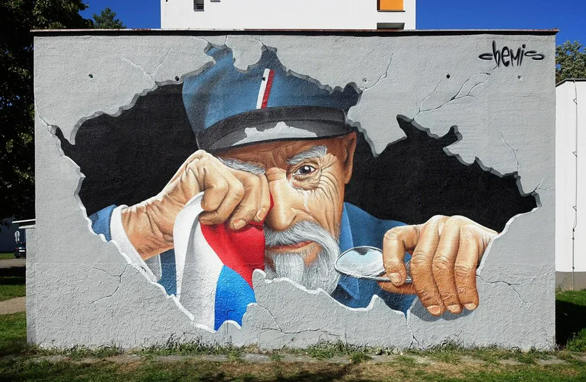 He created a tearful Tomáš Garrigue Masaryk on the side of the small service building near the Faculty of Science of the Palacký University in Olomouc. It was painted in 2018 for a street art festival that coincided with the 100th anniversary of the founding of Czechoslovakia.