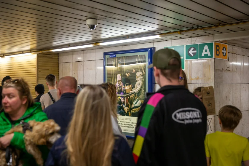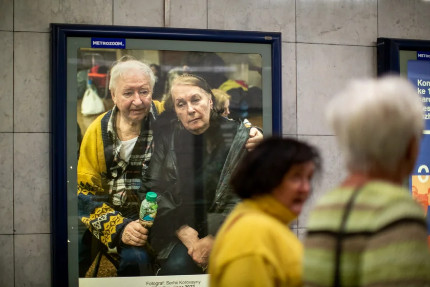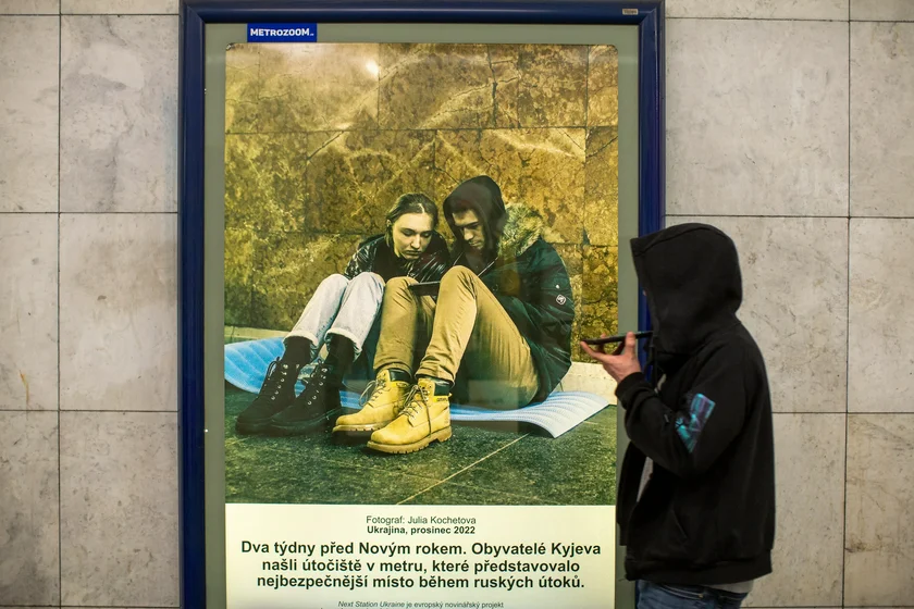 The people photographed in Ukraine often closely resemble passersby in Prague, and the stations themselves are very similar, as the photos below can reveal. The photo of the couple huddled and looking at a phone was taken in December 2022, the photo of the two senior citizens was taken in February 2022, and the woman in a tent is from March 2022.