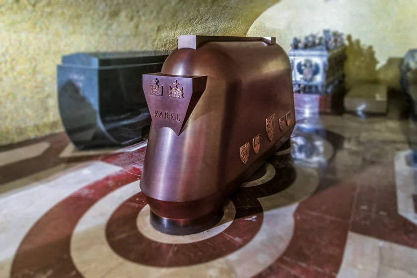 The Royal Tombs can be found down a narrow staircase in the lower level of the cathedral. The crypt houses the tombs of Emperor Charles IV, Emperor Rudolf II, King Jiří z Poděbrad, King Wenceslas IV, and several other prominent rulers and their wives. The cathedral basement features stonework from an 11th-century basilica.