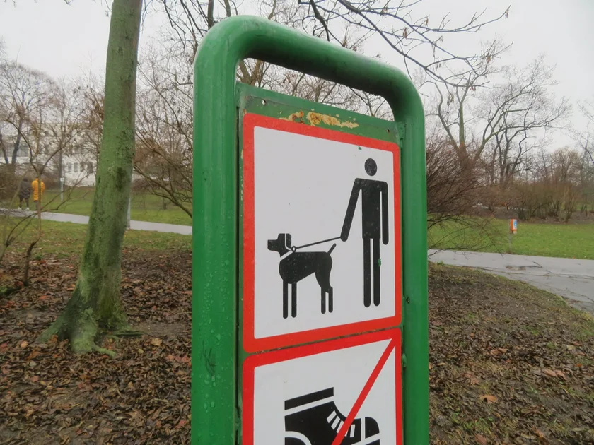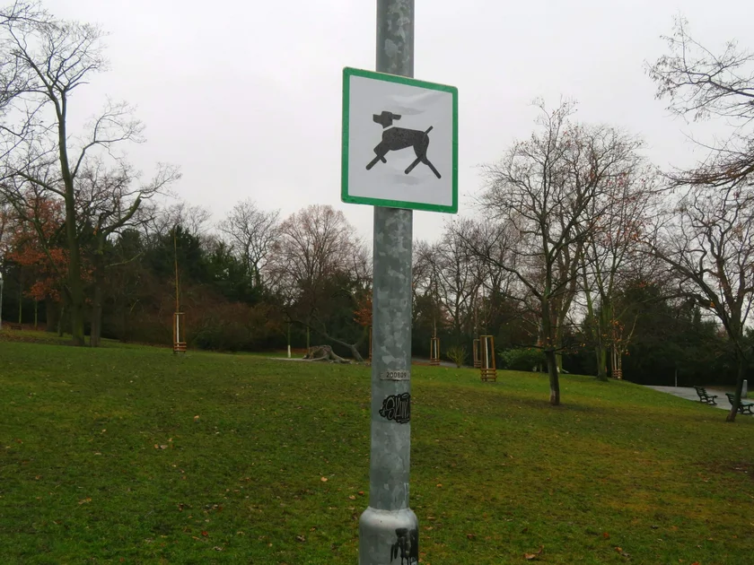 Most Prague parks and green spaces have signs near the entrances stating the park rules. These usually include pictograms of dogs, bikes, rollerblades, and other items. If dogs are banned completely, there will be a red line through the image of a dog. An image of a dog on a leash shows that dogs are permitted, but cannot run free.