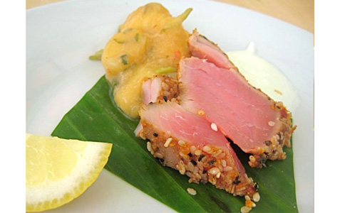 I had the seared, pepper-crusted tuna with banana chutney and wasabi mayo (100 CZK). I loved this.