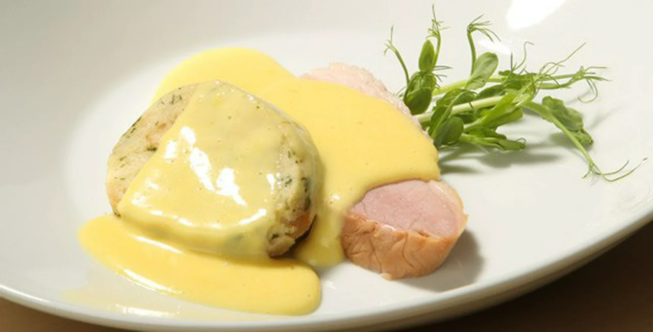 Pour the sauce over warm ham in slices and complete it with tender bread dumplings.