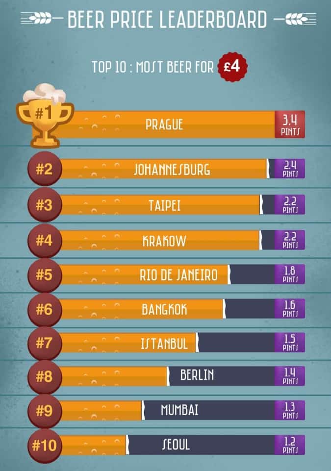 The data reveals that in the Czech capital £4 gives you almost three and a half pints, making it the world’s top city for getting the most beer for the least money followed by Johannesburg, Taipei, Krakow, and Rio de Janeiro.