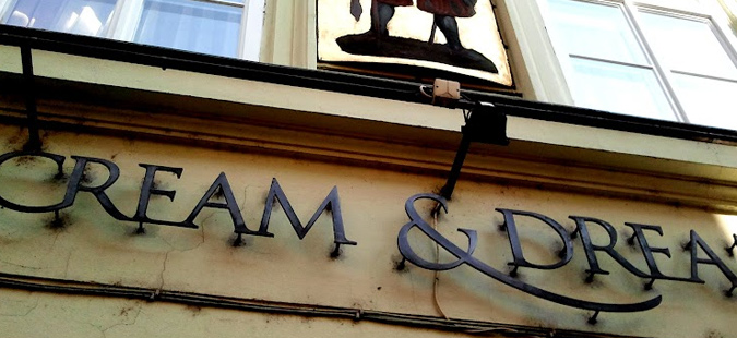 Cream & Dream (Husova 12), is a ten minute walk from Národní Třída, down what I like to call the “hanging man street,” after David Černý’s sculpture of Sigmund Freud. Firstly, decide what vehicle you’d like to eat your ice cream in because the prices vary accordingly—80g in a cup (35 CZK), in a glass dish (50 CZK), in a cone (40 CZK) and in a waffle cone (45 CZK). The décor doesn’t wow, but the ice cream sure does. Two of my favorite scoops there were the melon and white chocolate flavors. The former tasted just like a ripe, juicy cantaloupe in summer, and the latter had exactly the right level of creamy sweetness without coming off too rich or sickeningly sweet.