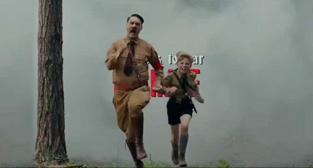 The one-minute teaser trailer released has a rapid montage of scenes of the Hitler Youth and its leaders, played by Sam Rockwell and Rebel Wilson, other war-related images and avbrief shot of Scarlett Johansson forcing Jojo to look at something. Text in white and red letters tells the audience that “from visionistical director Waititi Taika comes a satire that goes to war on hate.”