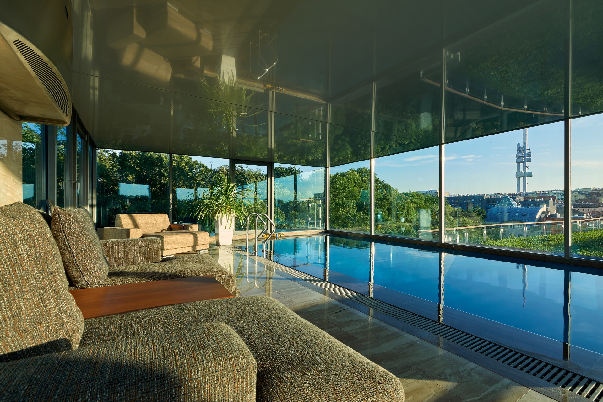 Thanks to glass walls on all sides of the penthouse, residents get beautiful views of Prague from every location.