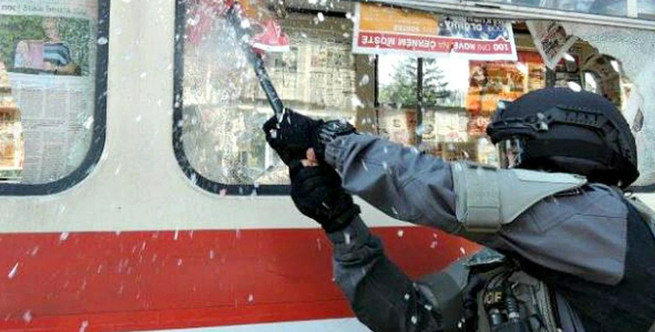 In photos and video posted to local news servers, officers are seen responding to gunfire and a small explosion, and smashing out windows of a (presumably) decommissioned tram.