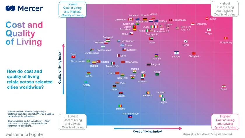 While Mercer's cost of living index by itself may not mean much for the average expat, evaluation alongside with the company's quality of living report, also conducted each year, makes for a good comparison: