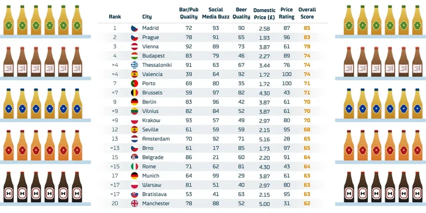 Underdog nations Spain and Czechia claimed the top spots, with Madrid leading the pack and Prague closely following. Brno tied with Amsterdam for number 13 on the list. Despite being renowned for beer culture, top Belgian and German destinations (Brussels and Berlin) found themselves in seventh and ninth place in the rankings, respectively.
