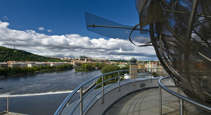 The impression from outside the building is something special, too. The restaurant is in the “Dancing House” — sometimes called the “Fred and Ginger building” — created by Vlado Milunić and Frank Gehry.