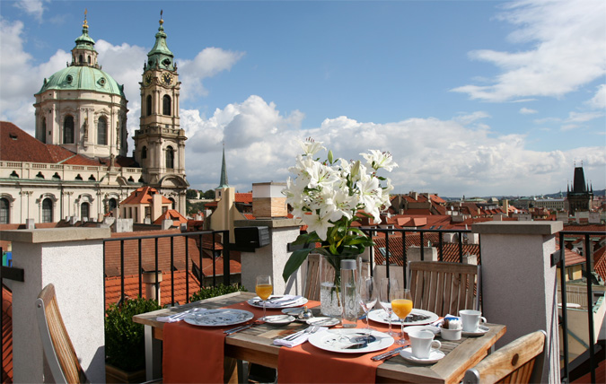 But they also have tables perched on top of the hotel, in the middle of Malá Strana. The dome of the St. Nicholas Church is practically in your lap.