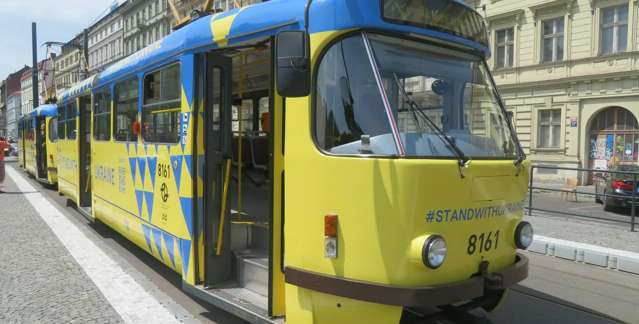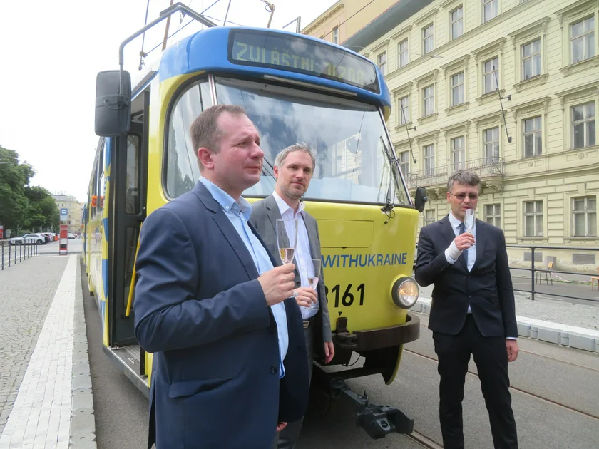 A tram painted in the colors of the Ukrainian flag of yellow and blue will run on Prague streets for at least the next six months. Prague Deputy Mayor Zdeněk Hřib and Ukrainian chargé d'affaires Vitalii Usatyi officially introduced the tram by pouring sparkling wine in front of it and making a toast. Both of them commented on the urgent need to continue helping Ukraine in its struggle against the Russian invasion.