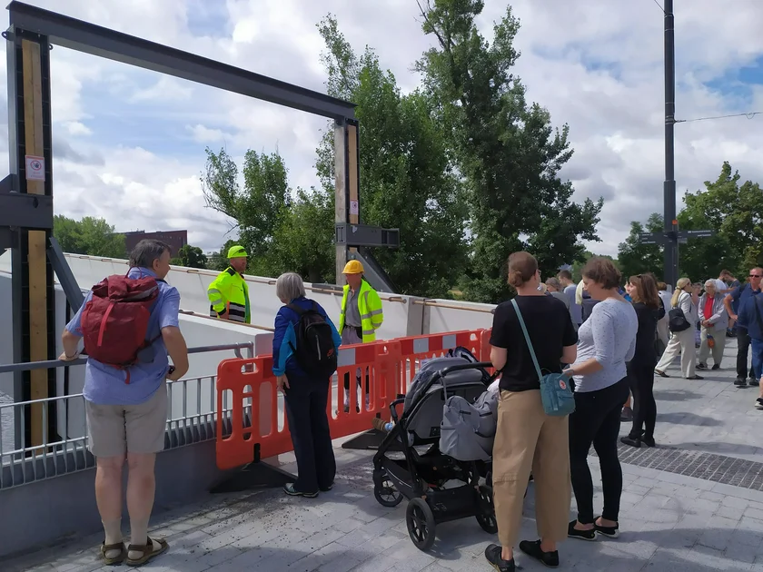 Svoboda and Hřib were among the first people to cross the bridge, using shared bicycles to make the trip. Members of the public who showed up at noon at the Holešovice and Karlín sides to be the first across were disappointed. They had to wait until the end of the VIP ceremony on the island before the gates at both ends finally opened around 1 p.m.