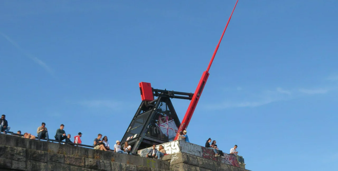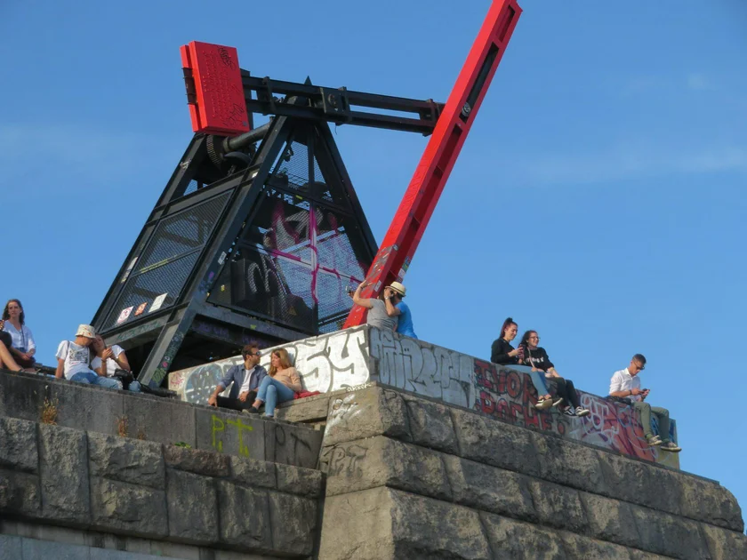 The Metronome is visible from the edge of Old Town Square, looking down Pařížská Street, across Čechův most to the cliff of Letná park. The actual name of the artwork by sculptor Vratislav Novák is Time Machine (Stroj času), but that never caught on and it has been called the Metronome for its entire existence.