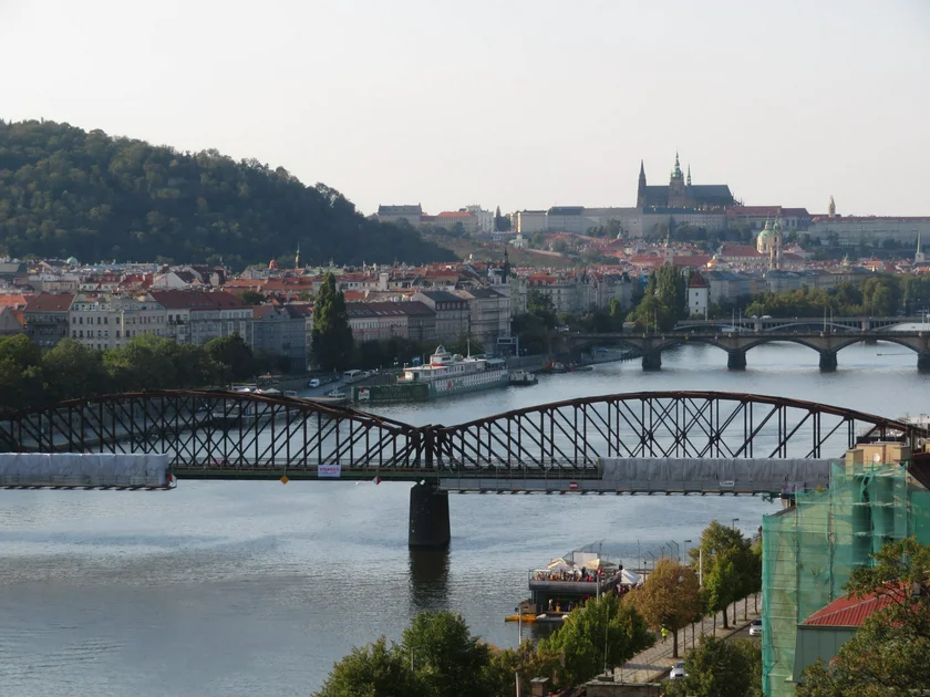 A railway bridge was built in 1871 to connect the people factories in Smíchov to the right bank of the Vltava. The bridge was rebuilt in 1901 with two tracks and three parabolic steel spans to meet the increased traffic demand. It is currently the subject of a dispute, as preservationists want to restore it while the Railway Administration (SŽ) wants to replace it.