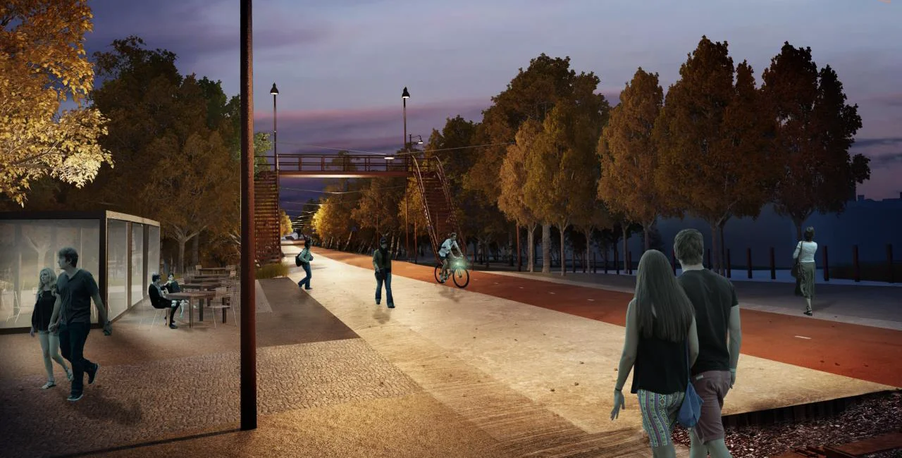 “The promenade should look generous, calm and minimalist, intuitive and clear in terms of orientation. The morphology and materials should be contemporary and at the same time refer to the railway past — the basic materials are light concrete, rusty colored asphalt, gravel and corroded steel. The promenade’s public lighting is placed on overhangs between poles so they frame the free space of the promenade and its continuous flow,” Cach said.