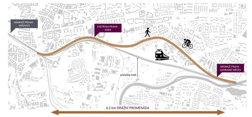 A four-kilometer-long Railway Promenade between Prague’s Vršovice and Strašnice neighborhoods is planned along the former the Benešov line railway corridor. It should open in 2024.