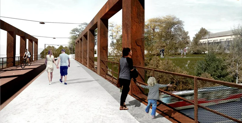 The plan includes the renovation of a historic bridge and three new footbridges. "The footbridges are strung like beads on a thread on the railway promenade route. Their morphology is minimalist. … The surface of the footbridge structure is made of patinated steel,” Tej said.