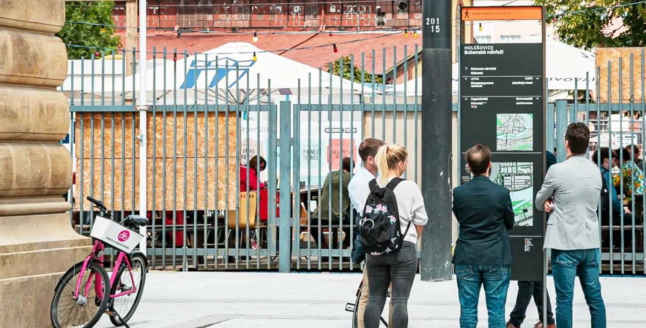 The project's focal point is the introduction of highly-visible obelisks, topped with an orange "Prague Walker" sign, which offer concise information about the surrounding area. These unique columns display maps of the immediate and wider surroundings within a walking distance of 5 and 15 minutes, along with directions to nearby points of interest.