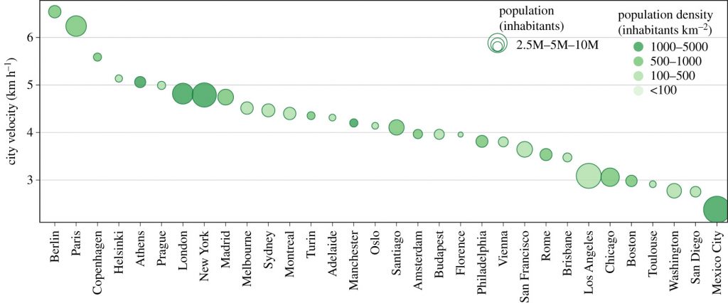 Berlin (6.54 km/h) Paris (6.24 km/h) Copenhagen (5.59 km/h) Helsinki (5.14 km/h) Athens (5.06 km/h) Prague (4.99 km/h) London (4.82 km/h) New York (4.79 km/h) Madrid (4.74 km/h) Melbourne (4.51 km/h)