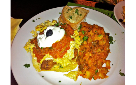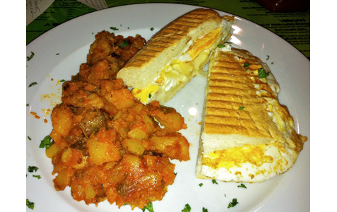 G-Man got the huevos rancheros (170 CZK). On the corn tortilla, there were refried beans, well-done scrambled eggs, cheese, a nice, chunky salsa, and sour cream. On the side there was a good potato hash and buttered toast.