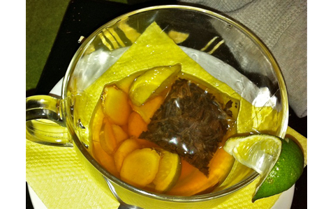 G-Man had a giant cup of black tea with ginger slices and lime.