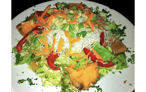 On the downside, the menu said it was topped with nuts, but I didn’t see too many. The lettuce could have been crisper. But the biggest problem was those noodles. They were stale and tough to chew. It would have been much better without them.
