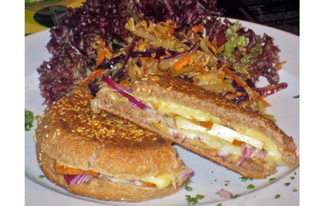 I had the “Up in Smoke” sandwich (165 CZK). It is billed as an “FX Reuben” sandwich that comes with smoked tofu, Swiss cheese, red onion, and Russian dressing with “crack slaw” on the side.