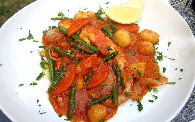 The tentacle came in a tomato sauce with green beans and potato. The octopus was very tender, but had a fishy flavor.
